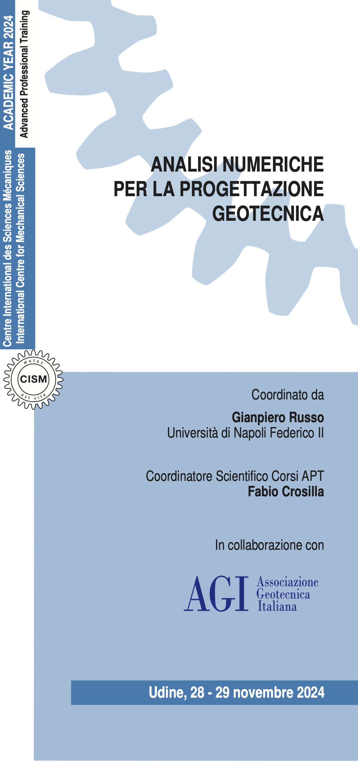 Il corso fornisce le basi indispensabili all'approccio alla progettazione geotecnica mediante l'uso di analisi numeriche.Tale tipologia di analisi verrà comunque preliminarmente inquadrata nell'ambito più ampio della progettazione geotecnica e dei vari strumenti a disposizione del progettista.