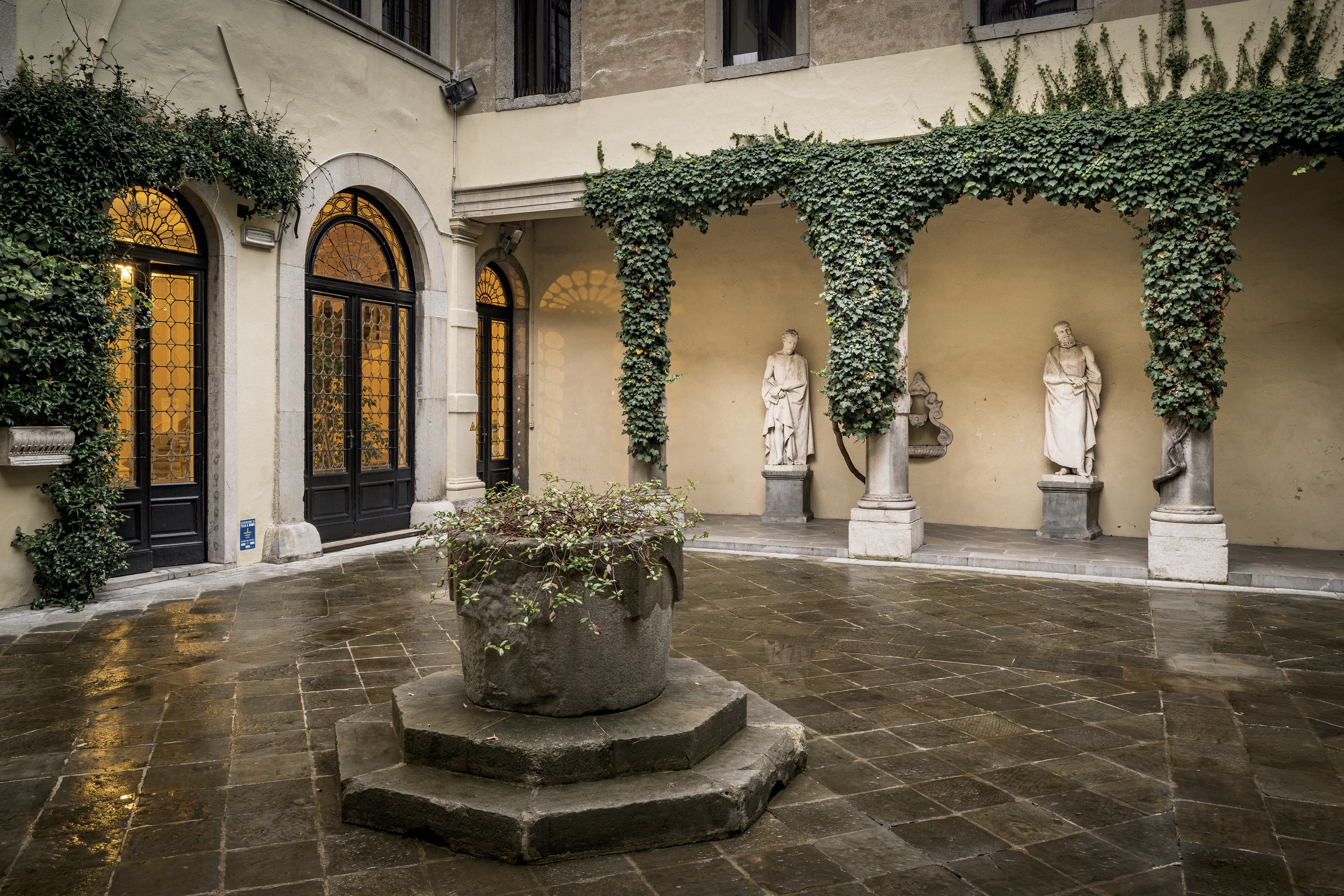 The hall also faces the small internal courtyard, with an ancient well parapet in the centre, which leads to the lecture room of the ground floor. This room can accommodate up to 65 people. It is an air conditioned room, equipped with wireless microphones, Wi-Fi, an interactive whiteboard and a chalkboard.