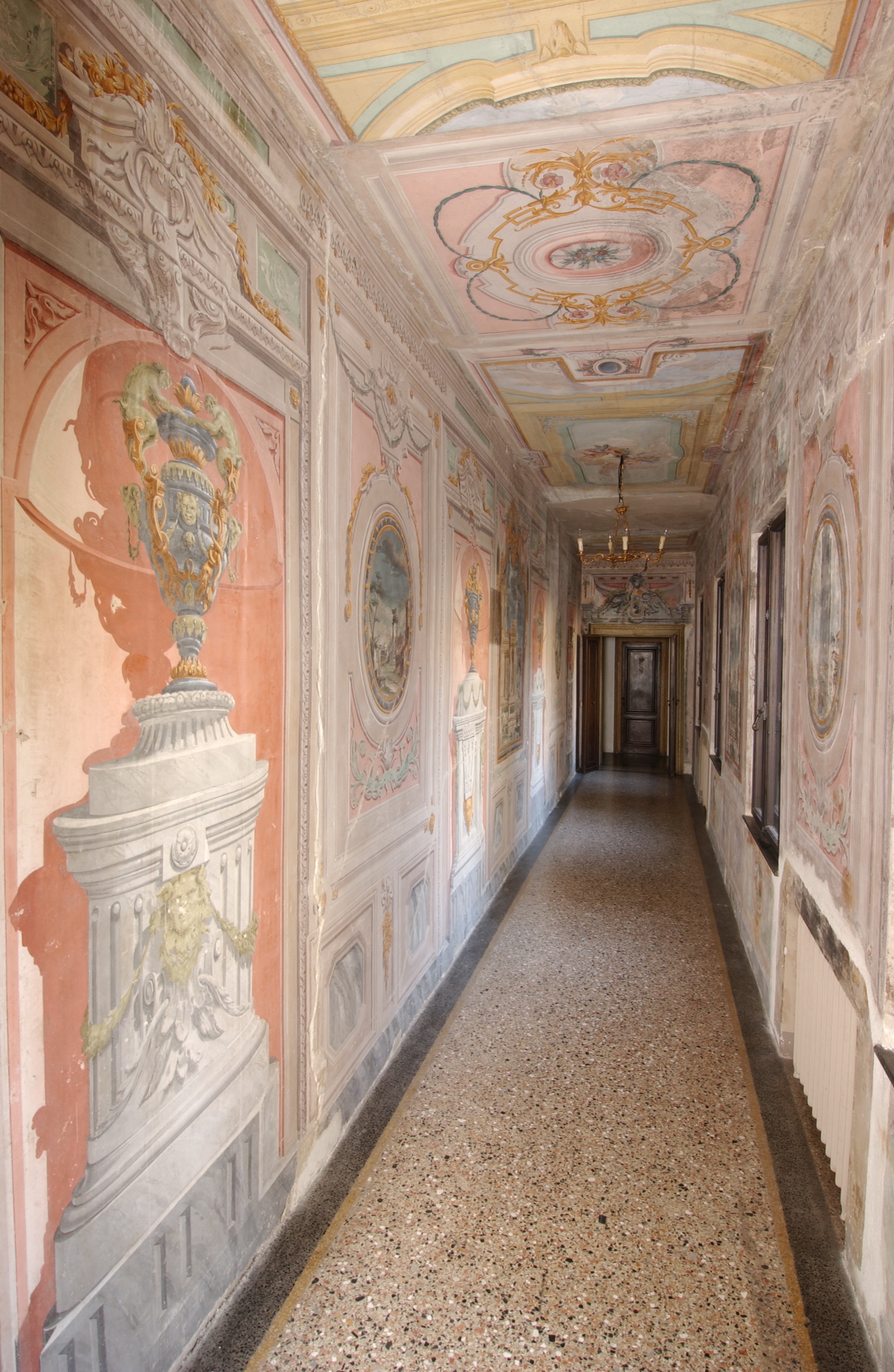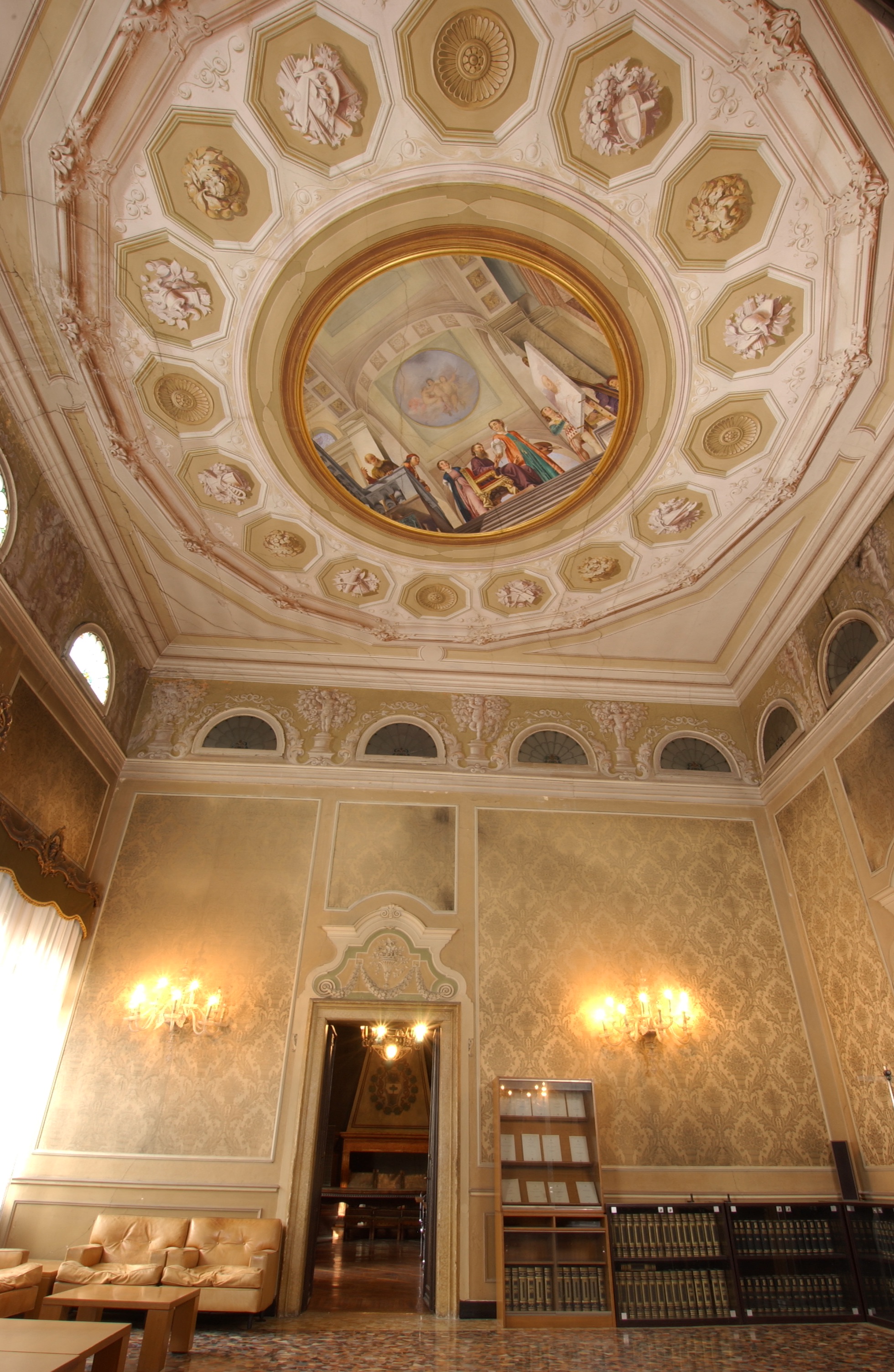 The canvas painting with the “Allegory of the arts” that decorates the vault was commissioned by the Count to the painter H. Stubysen, who tried to give the composition an eighteenth century air, with hints of the tradition of great Venetian painting. The scene is contained in an ovate with a strong stucco frame. It is executed with propriety both in the composition, with daring foreshortenings, and the fresh luminous colouring.